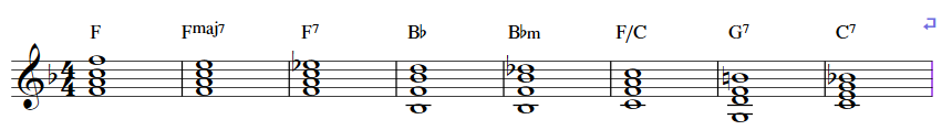 The bass notes of typical tonal harmonic progressions move counterclockwise around the circle of fifths (for example, a ii-V-I in F moves, with bass notes, G-C-F). The progression I use moves clockwise instead – with bass motion of F-Eb-Bb, before returning to F. Because of the bass voice motion in fourths, theorists call this a double plagal cadence; and, it is very common in popular music of the last century. I make extensive use of it in my music.