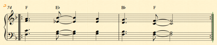 The Fmaj-Ebmaj-Bbmaj-Fmaj progression, heard throughout the piece. Beat 4 of m. 74 and beat 1 of m. 75 have passing tones in the upper voice. The sharp 11 over the Ebmaj chord in that voicing is similar to the Viennese Trichord, which is rare in popular musics, but common in mine!