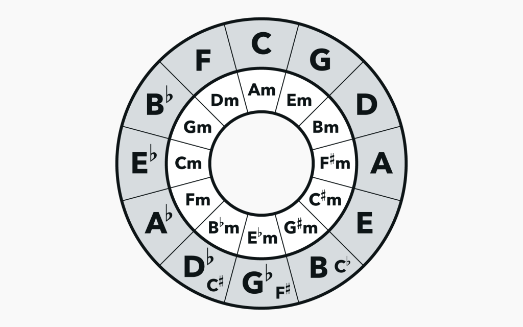 The circle of fifths is shown to follow bass note motion either clockwise or counterclockwise.
