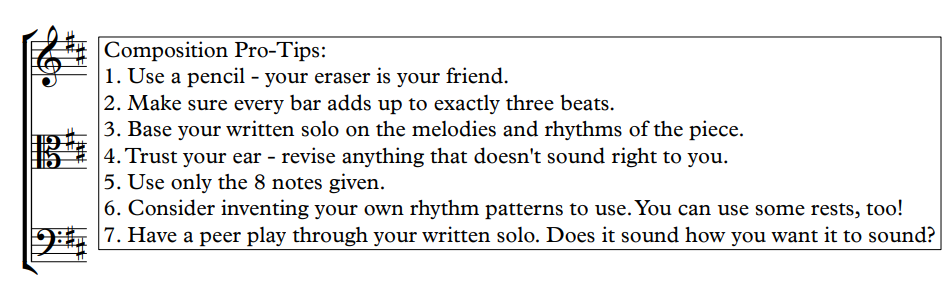 I want this piece to be adaptable to as many situations as possible. Some groups rehearse once a week, or twice a week in block schedule, or every day. As such, I am putting together supplemental materials for the educator to allow some flexibility. Students can improvise the solo, compose their own solo, or use the pre-composed solos. The pre-composed solos are four measures long, and can be combined to however long you want each soloist to improvise – I suggest either 4 or 8 bars each. The solo section can include every performer (which I would prefer!), only some performers, or be skipped (which I do not prefer!).
