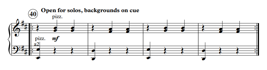 Underneath the soloist is a simple four-bar vamp over two chords: E minor, D major, E minor, D major. This repeats ad lib. to accommodate as many soloists as needed. Non-soloists play the vamp pizzicato, so the soloist can be clearly heard.